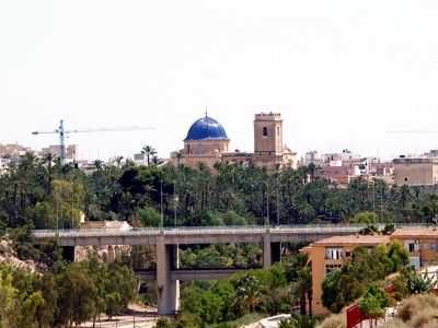 Vista de la Basilica de Santa María junto al palmeral de Elche.